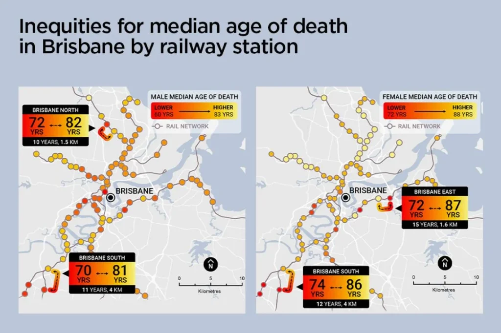 The results were difficult to ignore. Across Queensland as a whole, the median age of death for women spans between 68 and 88 years, while for men the range runs from 60 to 83. On the Redcliffe Peninsula line, men living near Zillmere station carried a median age of death of 72, a full 10 years below the figure for men near Geebung station just a few kilometres along the same line. The research also mapped a 26-year gap in median age of death between males living only 85 kilometres apart elsewhere in the state.